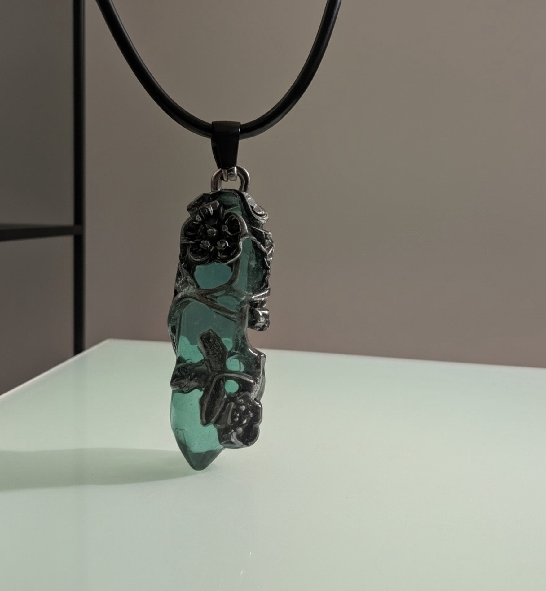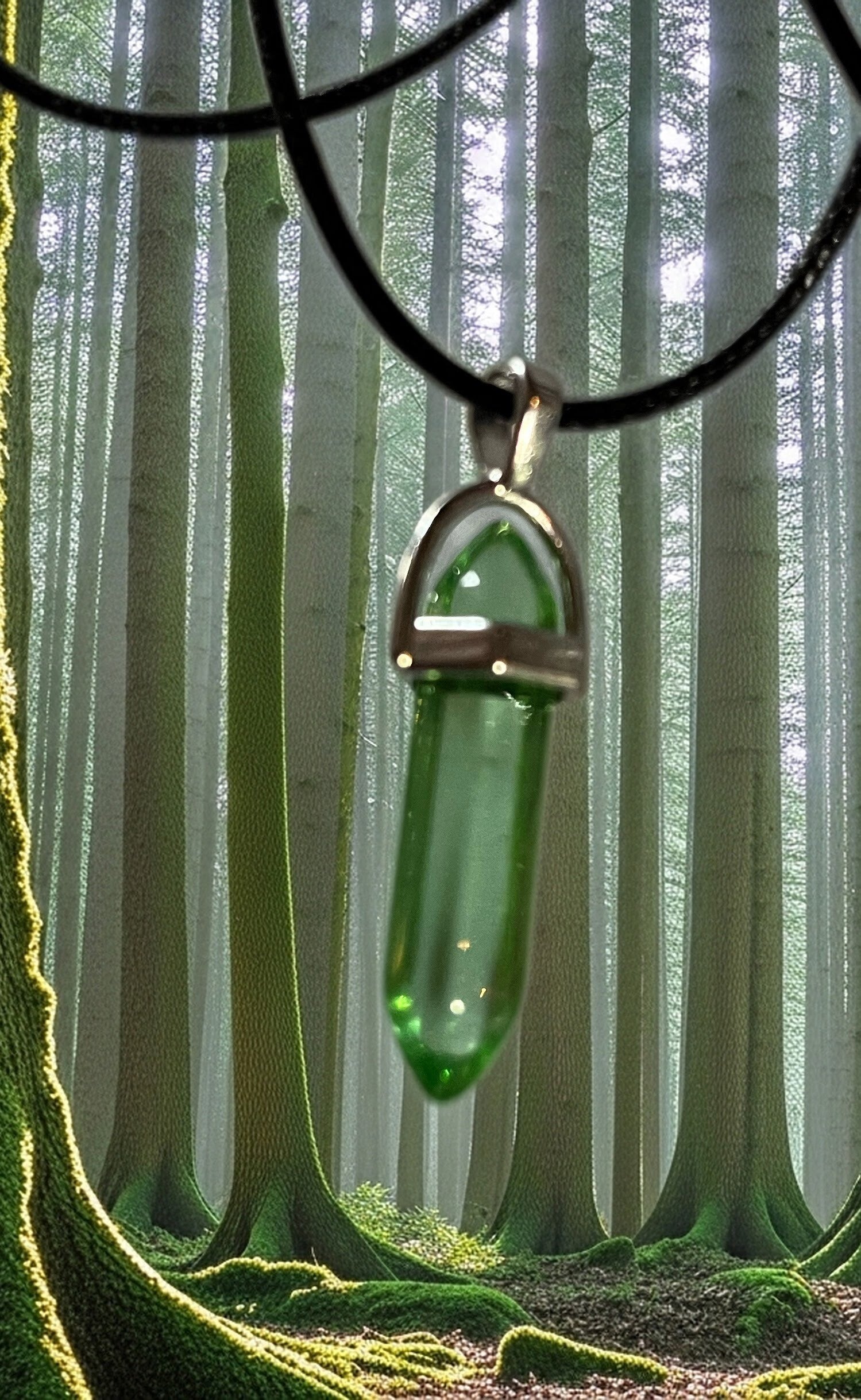 A green glass pendant or pendulum is often associated with healing, balance, abundance, and heart-centered energy, serving as a tool for spiritual guidance, meditation, and energy work.
