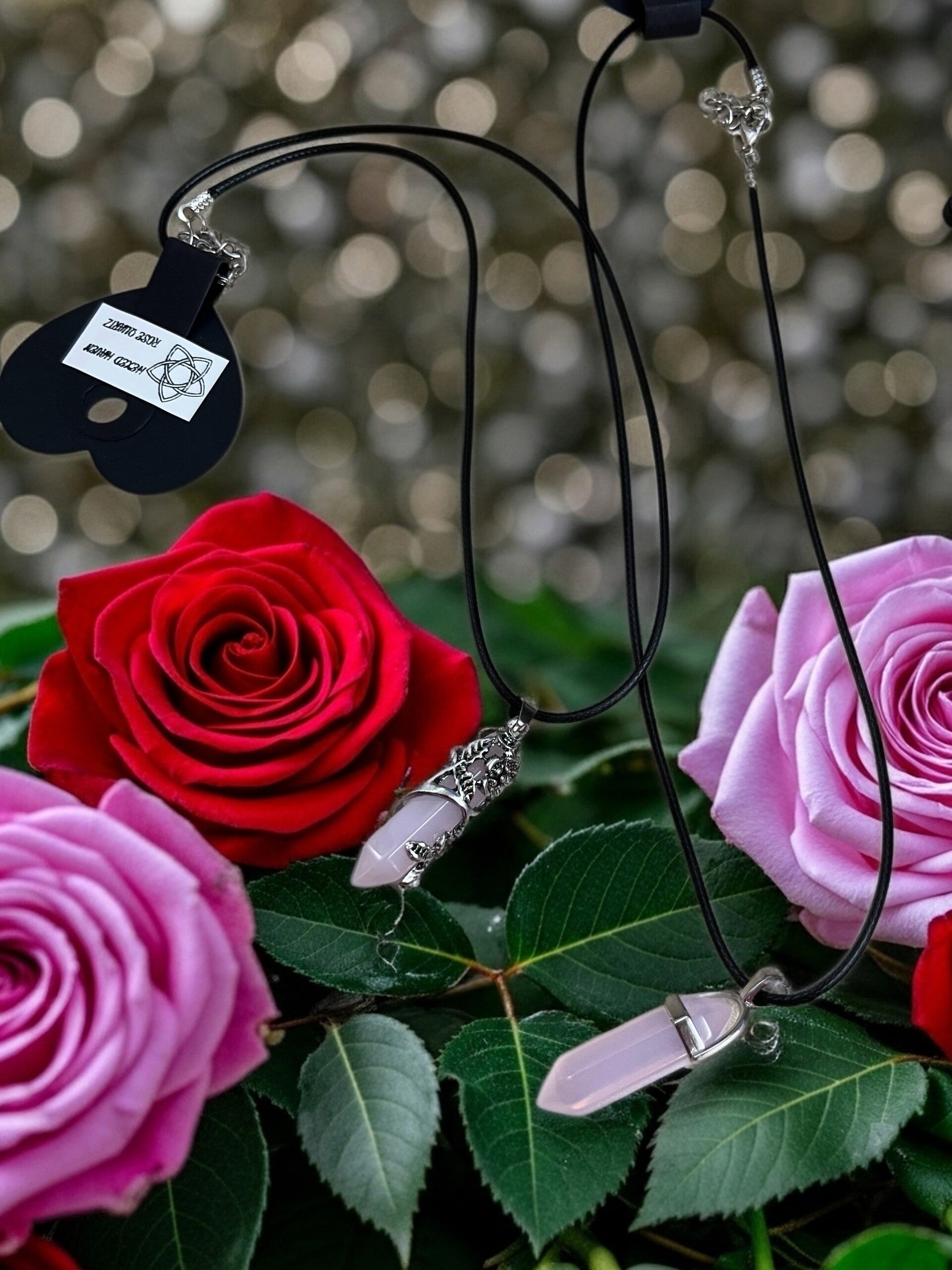 Rose quartz pendants and pendulums symbolize unconditional love, emotional healing, compassion, and heart-centered energy, serving as tools for personal harmony and intuition.